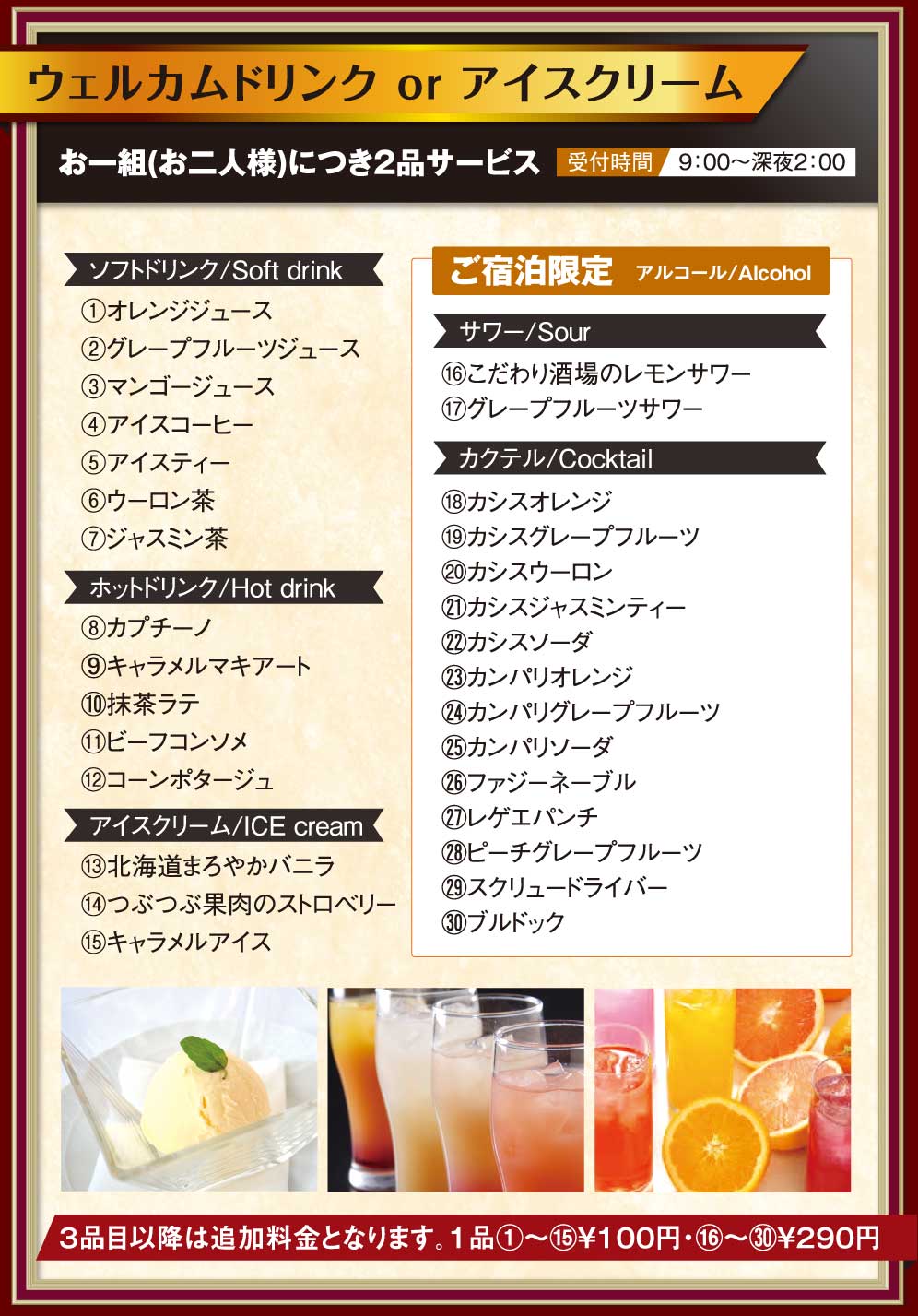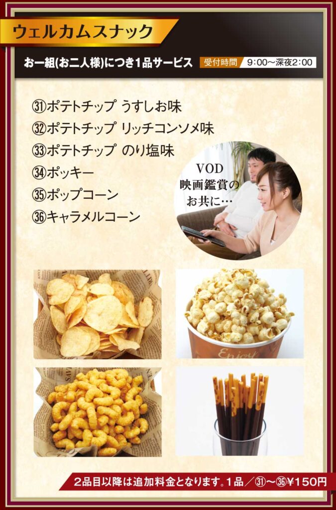 当ホテルでは、ドリンクやアイスクリームの「ウェルカムサービス」をご用意。宿泊のお客様には缶チューハイもお選びいただけます。また、ポテトチップやポップコーンなどから選べる「ウェルカムスナック」を1品サービス。全室にVODやWi-Fi、レインボーバスなど充実の設備を完備。静かな空間で、ふたりだけのひとときをお楽しみください。